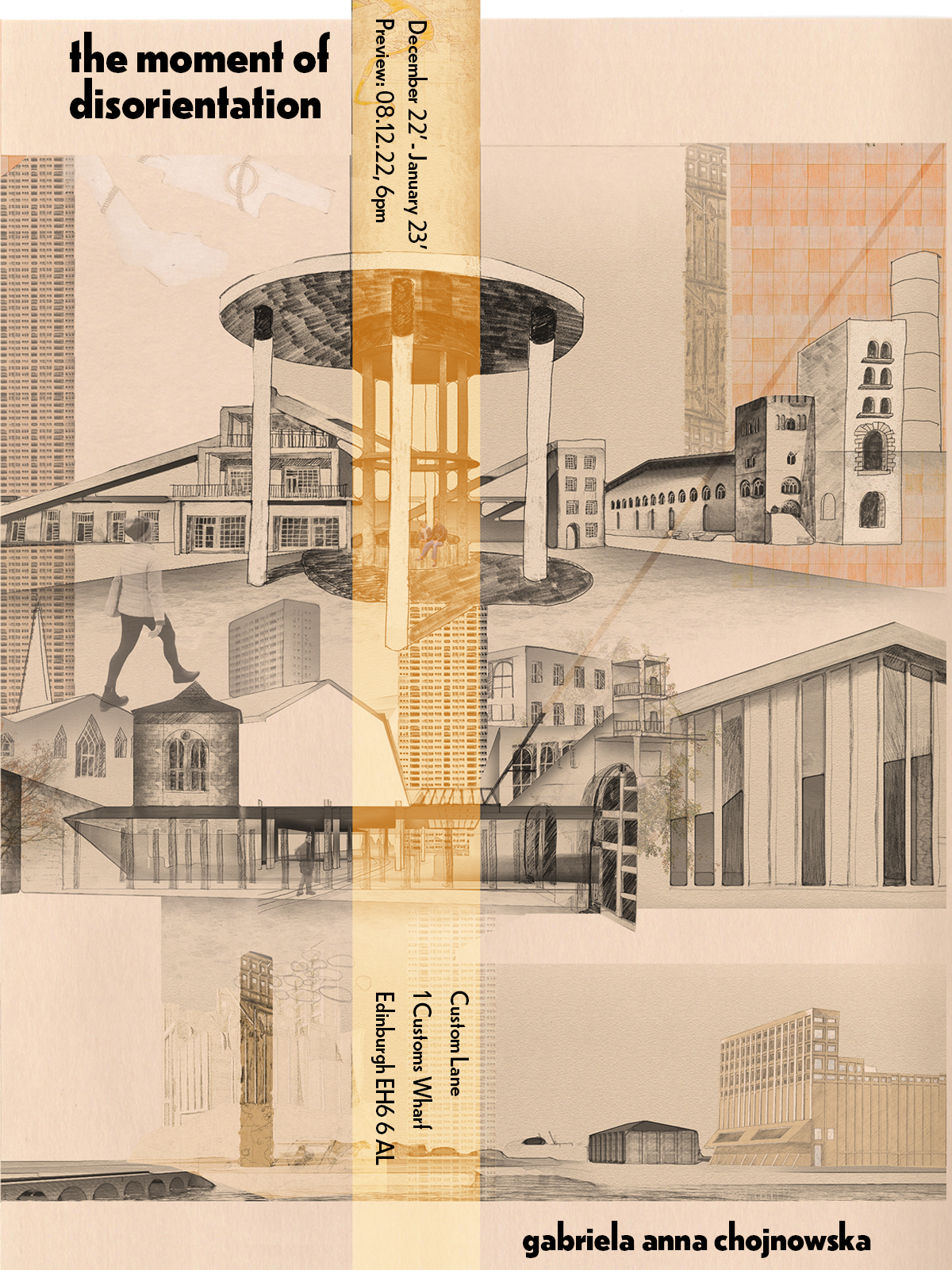 ‘The Moment of Disorientation’ is a body of work by Gabriela A. Chojnowska reflecting on a moment of ontological uncertainty and the tension between the material and the imaginary worlds. The project architecturally re-imagines the Port of Leith in an attempt to resist forces of what Andrew Herscher and Anooradha Iyer Siddiqi have termed as Spatial Violence. The character of the place is a result of its history, the evolution of its shape, its past and present functions and its current state – fenced, out of sight and undergoing spatially violent destruction. Behind the fencing, an alternative world exists and it is different to the one that we know. That world is currently hidden and enclosed.